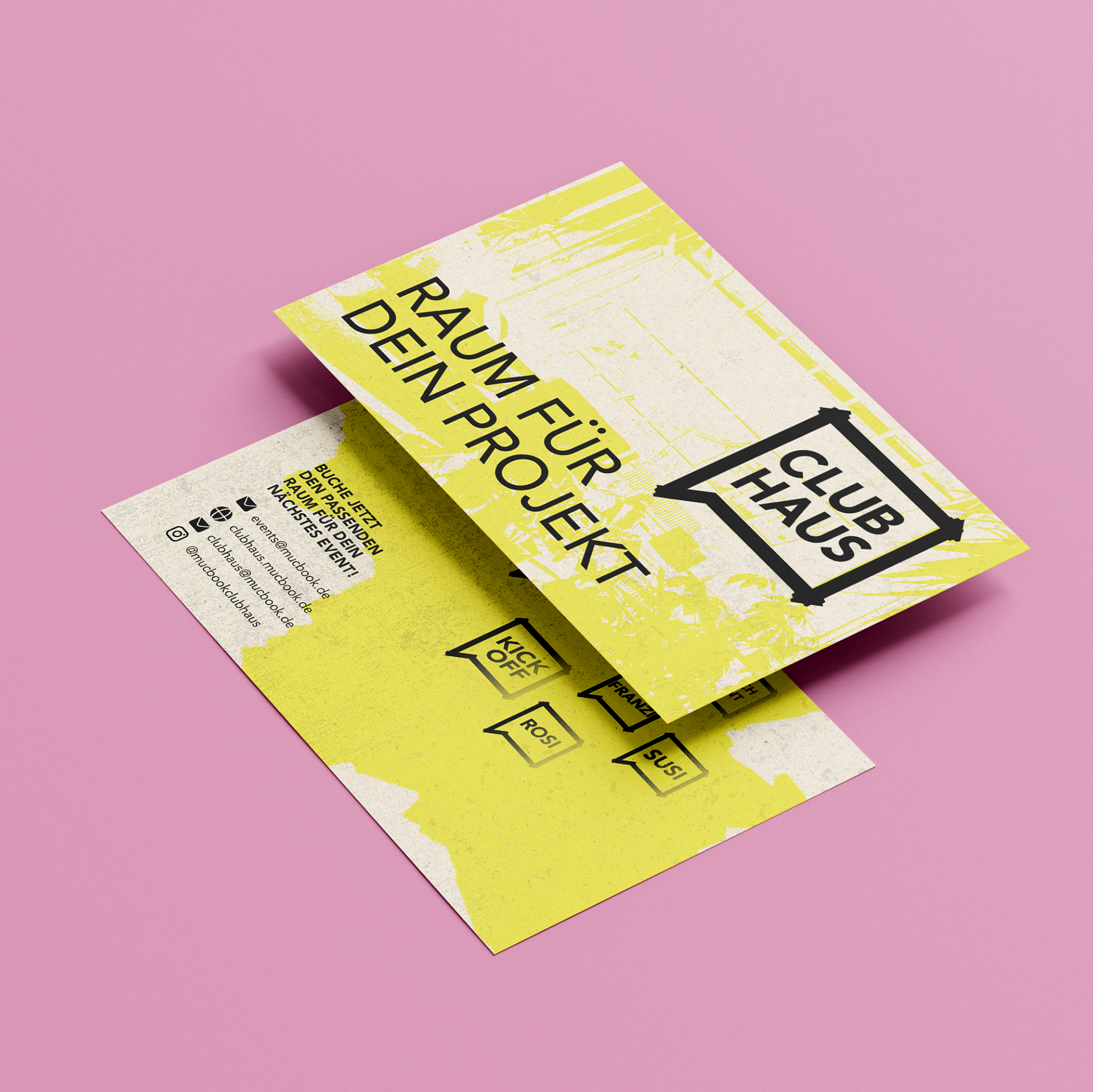 Das Clubhaus fördert kreative Zwischennutzungen in München. Gemeinsam mit dem Clubhaus entstehen Flyer, Visitenkarten und andere Printprodukte, um die Ziele des Unternehmens zu kommunizieren und junge Kreative anzusprechen.
